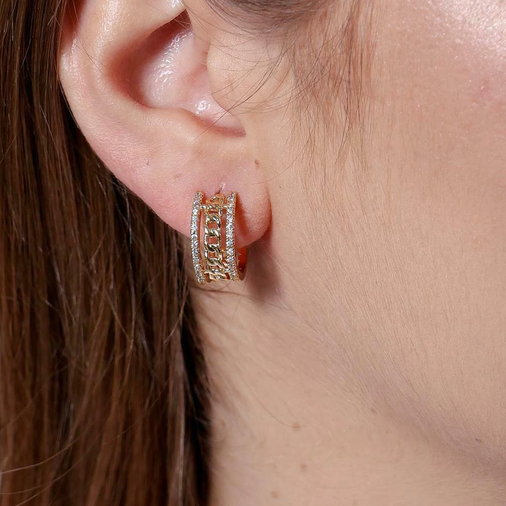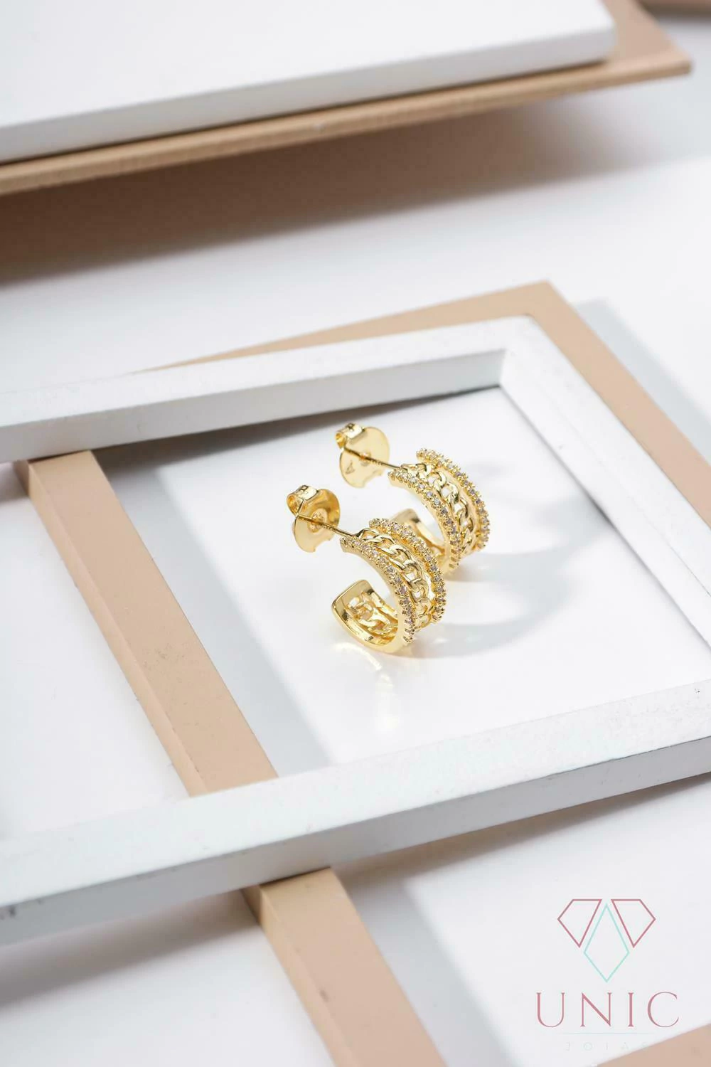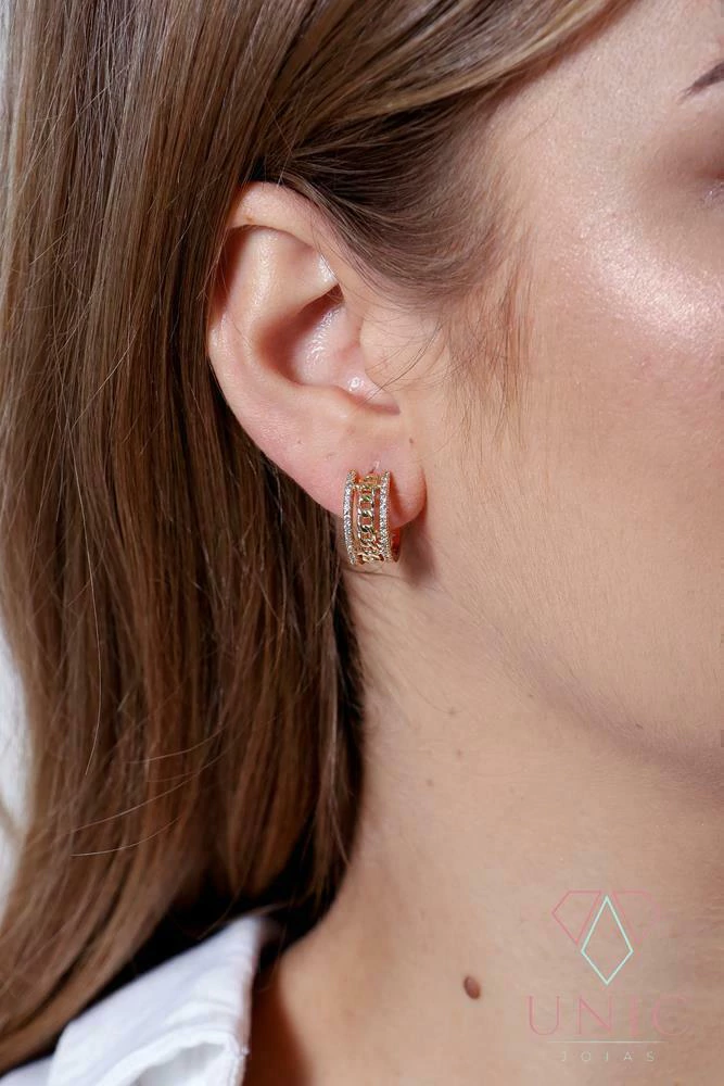 Os brincos Chains em formato de argola apresentam um design elegante e sofisticado, com uma cravação no estilo pavê e várias zircônias cristal que adicionam um toque de brilho sutil. Com detalhes que se assemelham a correntes, eles são perfeitos para mulheres que desejam um acessório único e moderno.