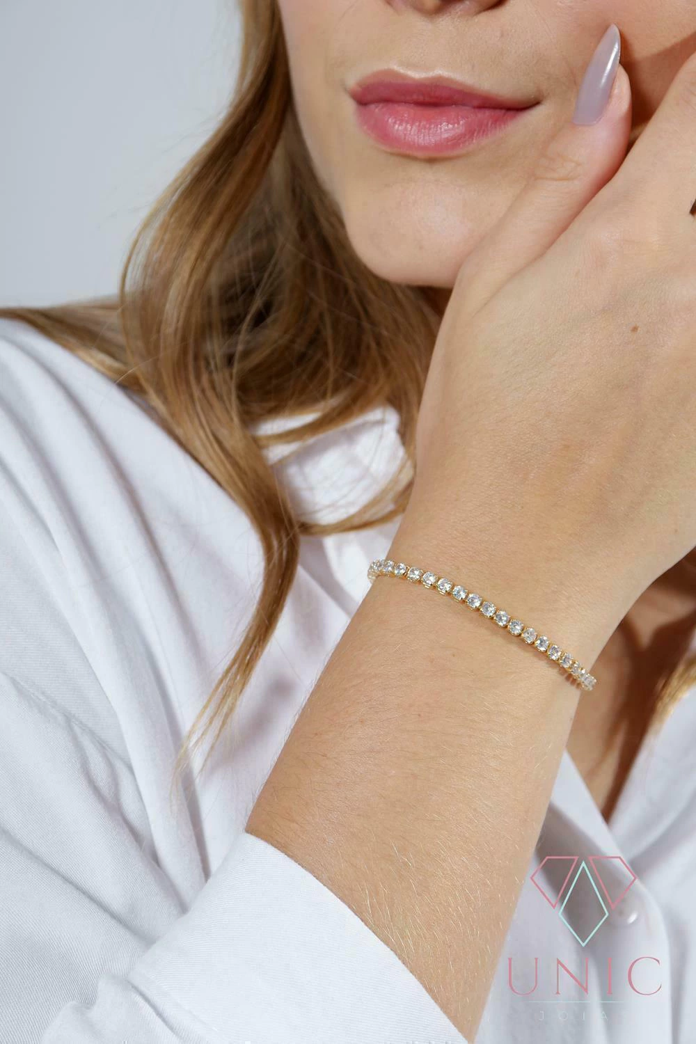 A pulseira Lux é uma joia sofisticada e elegante, com um banho de ouro brilhante e zircônias cristalinas. Possui um fecho de gravata para garantir um ajuste perfeito e seguro no pulso. A pulseira apresenta um design fascinante de zircônias cristalinas dispostas em toda a peça, criando um brilho deslumbrante e cativante. Além disso, a pulseira Lux possui dois corações nas pontas, que adicionam um toque romântico e simbólico à joia. Seu estilo clássico e elegante é perfeito para complementar qualquer visual, desde um look casual até um visual mais formal e sofisticado. A pulseira Lux é uma escolha excelente para quem busca uma joia requintada e elegante para adicionar à sua coleção.